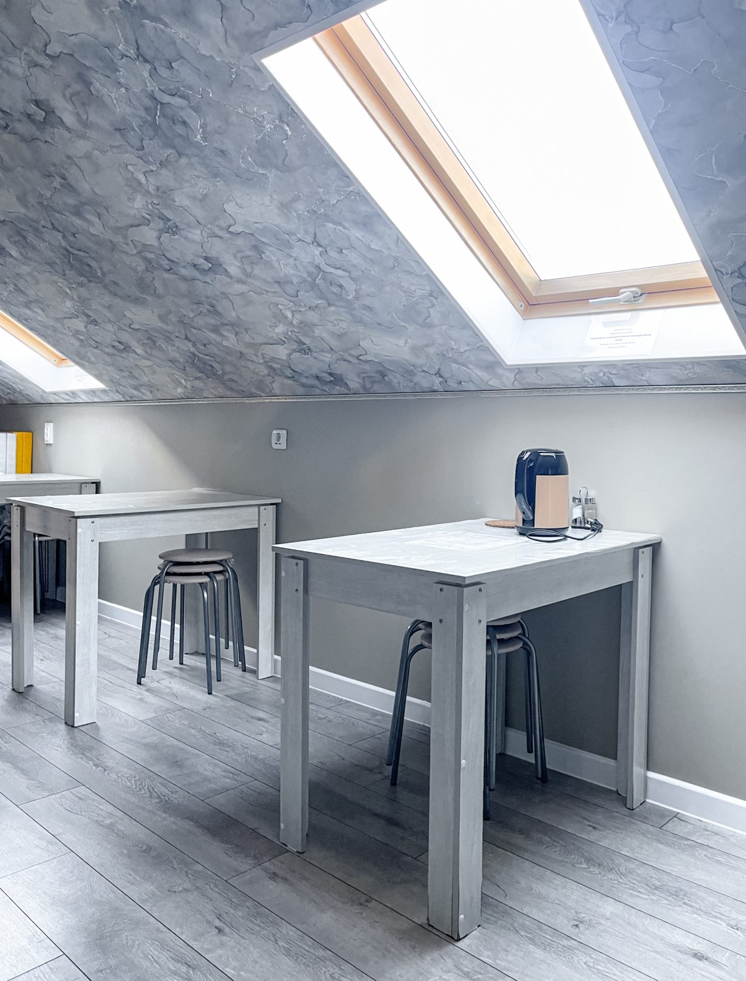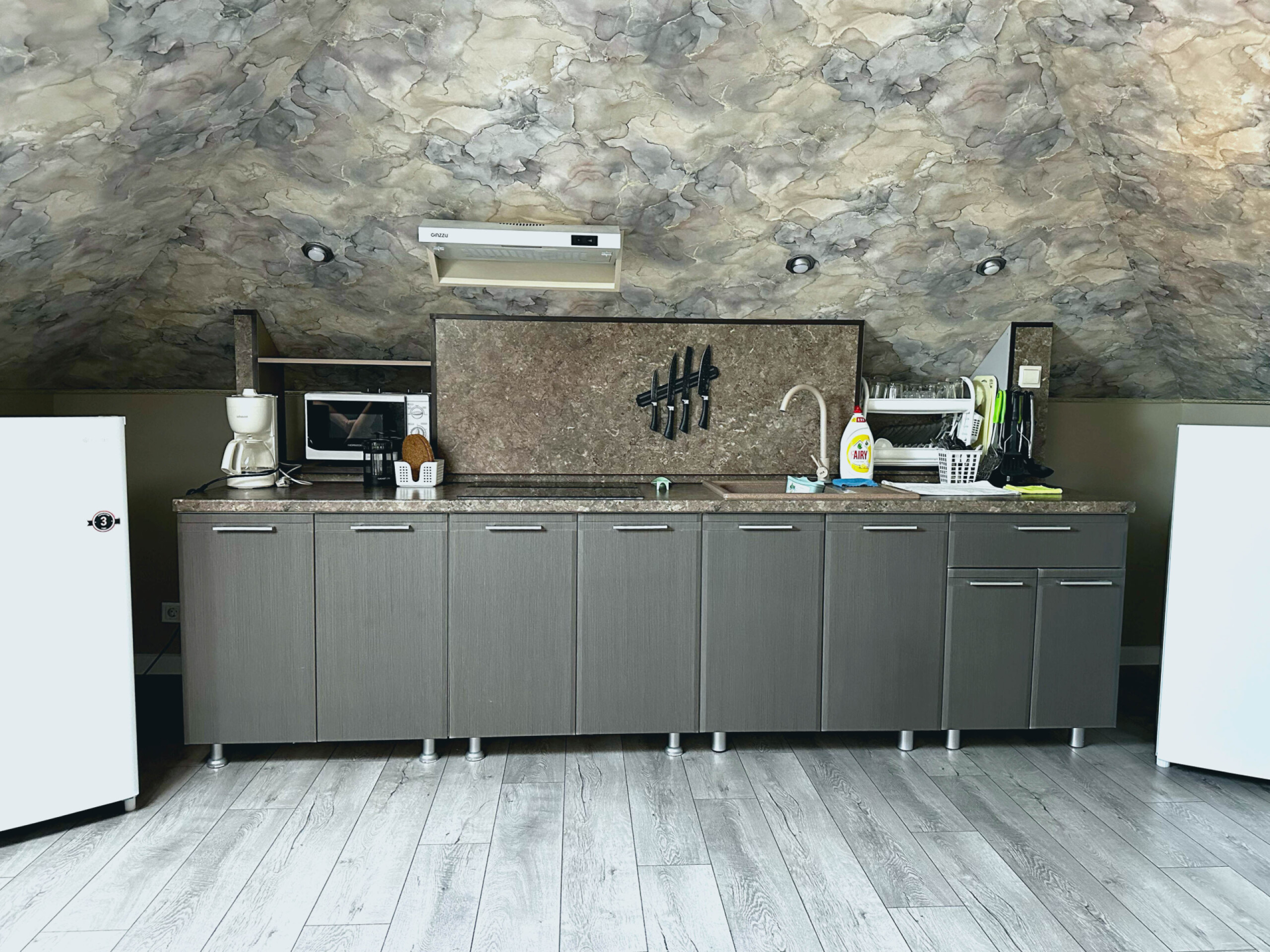Оснащенная современной техникой и посудой кухня-столовая на мансарде. Есть телевизор и 2 просторных холодильника с морозильными камерами.